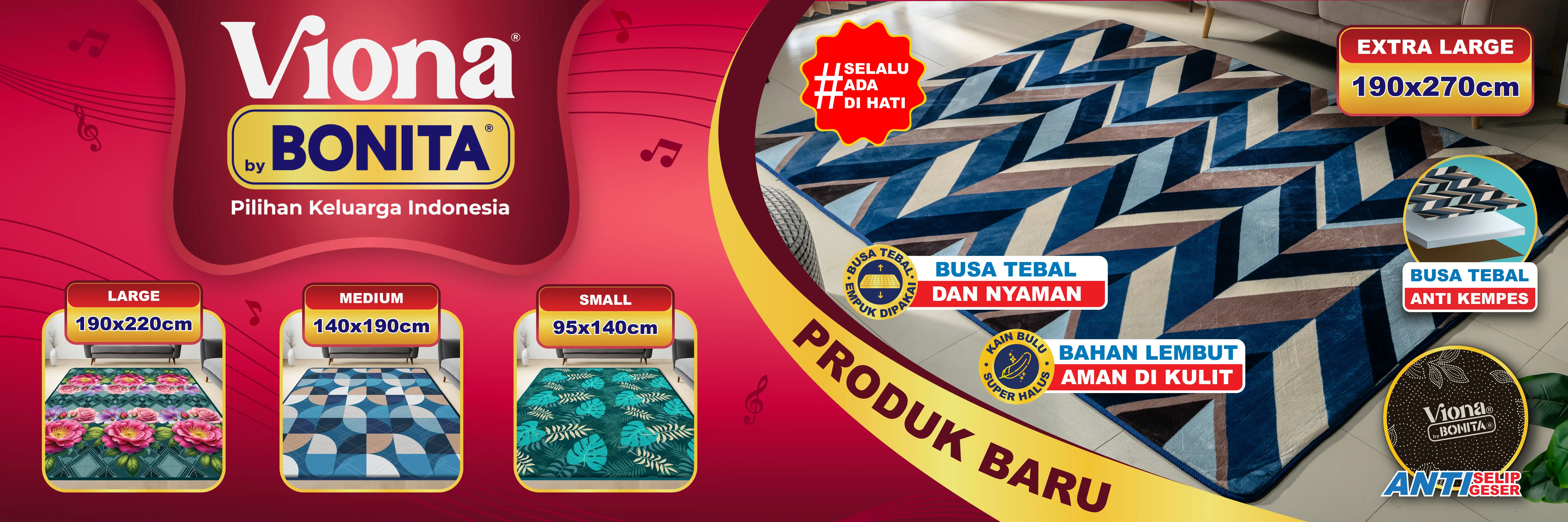 Karpet Viona adalah produk terbaru dari Viona, sister brand dari Bonita Group yang dikenal sebagai produsen sprei pilihan keluarga Indonesia. Karpet ini menggunakan teknologi printing 3D dengan busa tebal anti kempes berukuran 16mm dan 20mm. Dilengkapi bulu lembut yang nyaman, anti selip, tidak mudah geser, dan tahan lama. Pilihan ideal untuk menghadirkan kenyamanan keluarga di setiap sudut rumah.